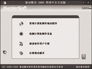 不过,最近好长一段时间小周没有打电话来“烦”我了,这倒有些奇怪,听说他最近好像添加了一些新的硬件设备,难道他另请高明了?似乎不太可能,于是找了个理由过去瞧瞧。呵呵,原来是小周安装了一款名为“驱动精灵2005”的软件,这款软件提供了驱动程序管理、检测未知硬件设备两大功能(如图1),前者可以备份、还原驱动程序,后者可以检测、安装未知设备的驱动程序,一举解决了两大难题,无怪乎小周这么神气呢。