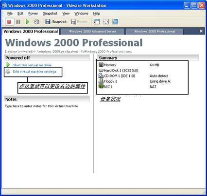 我这里所指的配置,就是对已经装好的虚拟机的内存容量,硬盘大小和数量,网络类型等进行修改,这样可以很方便地“变”出许多需要的