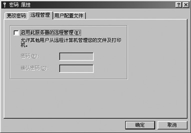 第二步是重新设置密码。我们运行"控制面板"中"密码",此时出现"密码属性"对话框,我们单击"更改密码"→"更改Windows密码",此时出现"更改Windows密码"对话框,要求输入旧密码和新密码,单击"确定"返回到"密码属性"对话框,选择"远程管理"标签页,取消复选框"启用此服务器的远程管理(E)前面的勾"(图1),再点击"确定"又返回"密码属性"对话框,选择"用户配置文件"标签页,选中项目"此计算机上的所有用户使用相同的首选项及桌面的设置(U)",第二步中的所有操作设置都不能少,否则就不能达到预期的效果了!