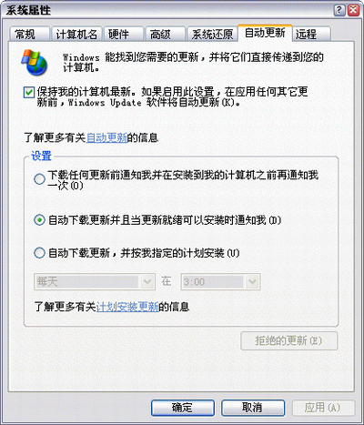 在图1所示的窗口中选择“保持我的计算机最新。…”复选框,再“应用→确定”即可。这样系统连上网络时,就会自动的下载更新程序,做到万无一失。