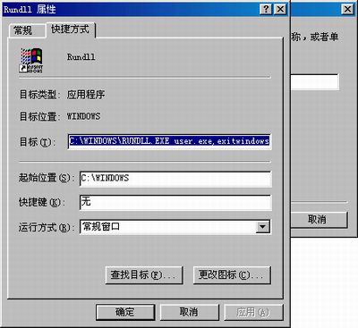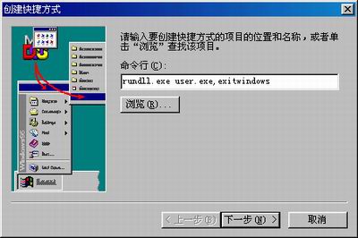 在桌面上右击选择新建菜单下的快捷方式,然后输入rundll.exe user.exe,exitwindows(如图1),为我们创建的快捷方式起一个名称,保存退出,这个时候我们只需要双击该快捷方式就可以退出WINDOWS,如果我们输入rundll.exe user.exe,exitwindowsexec,就是创建了一个不重新引导就启动WIN9X的快捷方式。