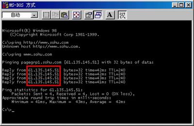 要实现本地域名解析的第一步,是要搜集整理好相关网站相对应的域名和IP地址,搜集的方法很简单,例如我要查看http://www.sohu.com对应的IP地址值我们进入到Ms-dos状态,在命令提示符下输入Ping www.sohu.com回车,如图1所示,对应在的IP地址为61.135.145.51,有了这个资料下面就好办了。