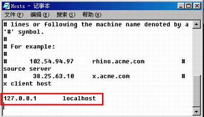 下面我们转到系统的安装目录下,找到一个名为hosts.asm文件,一切的秘密全在这个文件里面。右击该文件,在弹出的菜单中选择“打开方式”用记事本程序打开该文件,如果在弹出的快捷菜单中没有打开方式的,那么你可以用记事本直接打开。打开的文件内容如图2所示,我们发现最后一行为“127.0.0.1 localhost”其中的localhost表示本机的域名,127.0.0.1表示本机域名所对应的IP地址,聪明的读者可能已经意识到下面该如何进行了,不错,我们只需要该行的后面把按照同样的格式把IP地址和域名加上去就可实现修改DNS地址列表了。