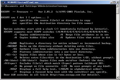 安装完毕,我们直接在命令提示符下输入xxcopy,(图2)你会发现它显示了很多可用的参数,正是因为这些实用的参数才使我们实现一些具体的操作。