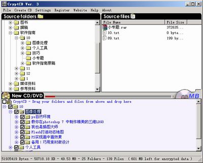 双击桌面上安装CryptCD建立的快捷方式“CryptCD3”打开软件主界面,主界面分为上下两部分,上方的“Source folders”是本地目录,右侧的“Source files”则是对应的本地目录下详细的文件,而下方“New CD/DVD”则是刻录的目标内容,现在我们就将要刻录的内容加入(图1)。