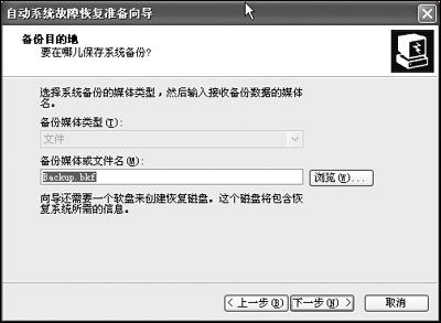 在Windows XP中单击“开始→所有程序→附件→系统工具→备份”,在“欢迎”选项卡中单击“自动系统恢复向导”按钮,启动“自动系统故障恢复准备向导”。根据提示,在“备份媒体或文件名”下面的文本框中键入镜像文件的名称和保存路径把镜像文件制作好,如图所示。