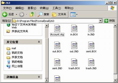 你会发现在邮箱的目录下有好多文件,在这些文件中都是存对出现的,每一对文件他们的主文件名相同,但扩展名不同,即扩展名分别为BOX、IND两个,其中收件箱—in;发件箱—out;已发送邮件箱—sent;废件箱—trash;自建信箱为aaaaa?,?按照邮箱建立的先后分别为1、2、3等,这样你要备份哪个文件夹把相应的两个文件复制到别处就可以了。