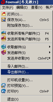 通过这样的方法可以备份邮箱中整个目录的信件,但却不能备份单封邮件,那怎么办呢?不要紧张,我们借助Foxmail本身的导出/导入功能来完成。选中要备份的邮件,打开“文件”菜单,选择“导出”命令就可以了(图2)。这样对于邮件的内容我们都能够做好很好的备份了。