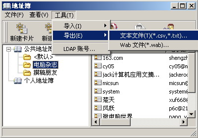但是同OUTLOOK一样,Foxmail同样有地址簿的备份问题。其实在Foxmail的安装目录下,有一个address活页夹,你只需要备份该目录下的文件,但该目录文件的名称没有规则,怎么办呢?没关系,我们还可以利用软件本身来完成。打开Foxmail的地址簿,选中要备份的地址夹,执行“工具”菜单下的“导出”命令(图3)。