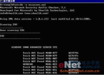 如果你不知道自己打的补丁是不是最近版本,可以使用微软提供的完整性检测工具——HfNetChk。HfNetChk是一个命令行执行程序,它借助一个由微软公司提供的不断更新的XML数据库,帮助我们从一个中心位置去了解当前网络所有机器中Windows产品的补丁程序的安装情况。检查的范围包括了IIS4.0、IIS5.0、SQL Server7.0、SQL Server2000(包含微软数据工程[MSDE])、IE5.01以及升级版本(如图3)。