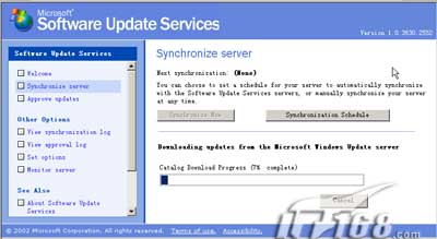 (3).同步操作 完成SUS Server参数配置后,就可以进行同步工作,下载用户需要的补丁文件。在管理页面左框点击“Synchronize server”项,接着点击右框的“Synchronize Now”按钮,开始同步工作。