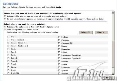 提示:如果局域网中部署了多台SUS Server,都和微软补丁服务器同步未免浪费大量带宽和时间,只需要其中一台和微软补丁服务器同步,其它的SUS Server和本地的此台SUS Server同步即可。这时就要选中“Synchronize from a local Software Update Services server”项,在输入框中填入目标SUS Server的机器名或者IP地址。 在“Select where you want to store updates”栏中设置保存补丁文件的方式,小强建议选择“Save the updates to a local folder”项,这样就可以只同步你需要语种的补丁,避免浪费,如小强只选择同步“Chinese Simplified(简体中文)”,其它参数使用默认值即可,最后点击“Apply”按钮。