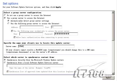 在“Select a proxy server configuration”中对SUS Server的代理服务器参数进行设置,如果SUS Server是直接或通过路由器接入互联网,一定要选择“Automatically detect proxy server settings”项,如果是通过代理服务器的话,要选择“Use the following proxy server to access the Internet”项,并在输入框中填上代理的IP地址和端口号。