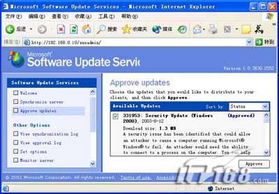 提示:除了在本地管理配置SUS Server外,还可以对它进行远程配置,在远端客户机中运行IE浏览器,在地址栏中输入“http:// SUS Server的IP地址/SUSAdmin/”,回车后,输入管理员帐号和密码即可。