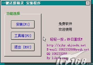 一键还原精灵就是针对以上问题而设计的。软件以GHOST 8.0为基础开发的,安全、稳定、快速,绝不破坏硬盘数据。在备份或恢复系统时不用光盘或软盘启动盘,只需在开机时按F11键即可。软件的安装非常简单和傻瓜化,在此就不再赘述。下面着重介绍其会“变”的一面吧。