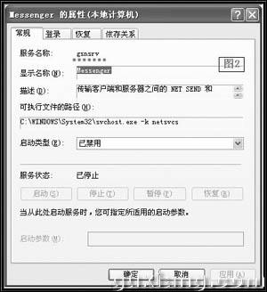 要修改“服务”的名称,这里需要用到两个工具,分别是“Srinstw.exe”和“Srany.exe”,这两个工具都能够在Windows 2000的资源工具包中找到,还是以“Messenger”服务为例,得到这两个工具后,双击运行“Srinstw.exe”工具,点选“Install a serice”选项,在“Serice Name”中输入你给“Messenger”服务重命名的名称如(Gsnsr),在选择路径那一步填“Srany.exe”文件的路径,其它设置默认即可,添加完成后,将原来的“Messenger”服务的注册表键导出备份(方法一中已经备份过),然后将“Messenger”服务“禁用”,再次运行“Srinstw.exe”工具,选择“Remoe a serice”选项将原来的“Messenger”服务从列表中删除,现在找到刚才备份的注册表文件打开编辑,将“[HKEY_ LOCAL_MACHINE\SYSTEM\CurrentControlSet\Serices\Messenger]”这行修改为 “[HKEY_LOCAL_MACHINE\SYSTEM\CurrentControlSet\Serices\gsnsr]”,其中“Gsnsr”是“Messenger”服务在向导中重命名的名称,保存退出文件,然后将其导入到注册表中,现在运行“Serice.msc”打开服务列表查看“Messenger”服务的属性,从图2可以看出其名称已被修改为“Gsnsr”,接下来结合“方法一”和“方法二”的方法给服务作修改或者索性将服务从列表中删除,最后把默认的共享都删掉,这样对方要入侵你的系统就更难了。