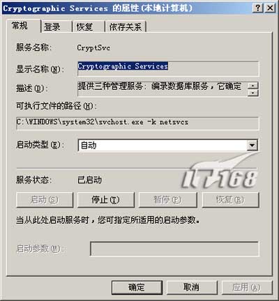 ·运行“Servies.msc”命令打开服务设置窗口,找到“Cryptographic Services”一项,右键单击它,选择“属性”,并在弹出的窗口中将其“启动类型”设置为“自动”。注意Cryptographic Services的启用依附于Remote Procedure Call (RPC) service,如果RPC服务没有启用,我们就不能起用Cryptographic Services。如果你看到你的RPC服务没有被启用,那么你必须使用Windows XP安装盘启动电脑,进入“恢复控制台”,输入命令“Enable RPCSS Service_Auto_Start”来开启RPC服务。
