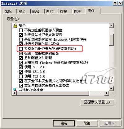·在“Internet 属性”窗口中切换到“内容”选项卡,单击“清空SSL 状态”,单击“自动”完成,在弹出窗口中单击“清除表单”和“清除密码”。接下来切换到“高级”选项卡,确保选中“使用SSL 2.0”和“使用SSL 3.0”两项,确保不选中“检查服务器证书吊销(需要重启动)”。