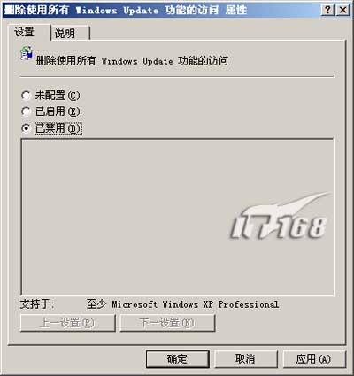 ·首先以管理员身份登录Windows XP Professional,在“开始→运行”中输入“gpedit.msc”命令打开“组策略”组件,依次定位到“‘本地计算机策略→用户配置→管理模板→Windows 组件→Windows Update”,在右边窗口中双击“删除使用所有 Windows Update 功能的访问”,将其设置为“已禁用”,确定后退出组策略管理器。