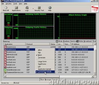 相信很多朋友都被曾经那些被防不胜防的木马及病毒搞得不知所措,有时候甚至中了木马也不知道。而且一般都是病毒木马先出来,然后才有杀毒软件的升级补丁,如果升级病毒防火墙不够快的话,那你的系统就很危险 了,下面就是我实践总结出来的打造安全系统的方法,具有一定的防范未知木马病毒的能力,拿出来和大家探讨。 首先,需要两个软件: 1.防火墙:sygate personal firewall 2.杀毒软件:mcafee viruscan enterprise 8.0i 两个软件缺一不可,相信大家都有自己喜欢的杀毒软件和防火墙,为什么选这两个软件,下面将一一叙述。 1111 首先,防火墙,Sygate Personal Firewall Pro的最大特点就是设置简单,控制直观。 软件安装完后提示重启,重启后会要求输入注册信息,进入主界面 如图:在最下面的框点右键选connection details,就会出现每一个程序访问网络的详细情况。