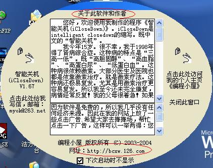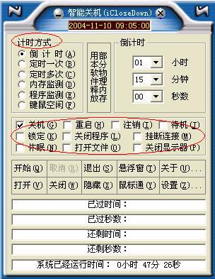 现在大多数人都进入了宽带时代,天天通宵下载大型软件、电影、歌曲。电脑天天开着,好心痛怕哪天坏了,总希望下载完了能马上关机保护爱机。那就用这款小巧好用的自动关机软件:智能关机iCloseDown! 下载地址:http://www.skycn.com/soft/14622.html 作者主页:http://bcxw.126.com/ 推荐理由: 1、小巧:此软件为绿色软件,大小仅为127kb,解压缩后就4个文件。 2、功能强大: a、它有七种计时方式:包括倒计时、定时一次、定时多次(常规)、定时多次(高级)、内存监测、程序监测、键鼠空闲等。 b、除了能关闭计算机外,还可以执行其他任务:重新启动计算机、注销当前用户、使系统进入待机状态、以密码锁定计算机、关闭指定的程序、挂断拨号连接、使系统进入休眠状态、打开指定的文件(包括程序,即“可执行文件:EXE文件”)、关闭显示器。 c、软件的其他许多功能以及特色包括:释放部分内存、显示内存使用状态、立即执行任务、打开或关闭光驱仓门、整点和半点报时。执行完任务后关闭自己、丰富的菜单命令。丰富的命令行功能。 3、不得不提一下开发软件的作者:作者是一位年仅15岁,很不幸得了肾病综合症。这种病依赖激素治疗,病情还极易复发,至今还未完全康复!大家多去网站支持他!