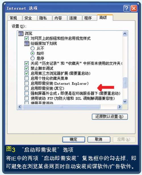 当然,与其它的应用软件捆绑在一起,并不是间谍软件唯一的传播途径,它也可能混杂在网站之中。比如说,当你键入某个网址时,屏幕上将会弹出一个窗口,询问你是否需要安装某个软件,一般情况下,如果用户选择不安装,就无法浏览该网页。千万不要点击“Yes”按钮,如果你确实想浏览该网页,不妨安装一个弹出式广告的拦截软件,或是使用某些特殊的网页浏览器,比如说Mozilla Firefox(请登陆www.mozilla.org/products/firefox下载),它自带了一个弹出式广告拦截器。已经推出的Windows XP Service Pack 2中包含的IE也将会有内置的广告拦截器。