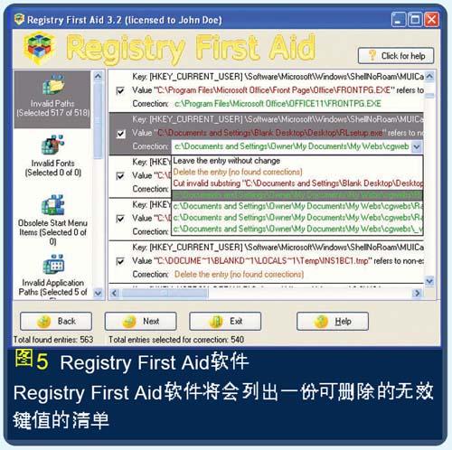 另一个值得推荐的软件就是Rose City Software开发的Registry First Aid(请登陆www.rosecitysoftware.com查阅详情)。它的安全性比较高,不会破坏电脑系统。每一次进行清理之前,它都会将注册表先做一个备份,如果选择Windows Backup,该软件将会提示你备份系统。它只会删除一些它认为可以删除,并且不会破坏Windows的无效键值。其实能做到这一点已经是难能可贵,因为过多的无效键值是导致系统减速的“罪魁祸首”。在Registry First Aid的界面上,用户可选择扫描不同类型的注册表故障。扫描结束之后,它将会提交一份列举出所有非法键值的清单(见图5)。虽然整个扫描过程需要花费一定的时间,但是,删除所有的非法键值只需要几秒钟。建议Registry First Aid的用户不妨定期清理一下电脑的程序注册表。