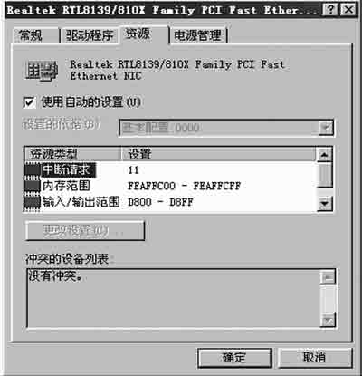 4.重新安装设备的驱动程序。 二、查看资源设置 确保设备在“设备管理器”选项卡上,只出现一次之后,请检查其资源设置:在“系统属性”的“设备管理器”选项卡上,双击冲突的设备,然后单击“资源”选项卡,检验是否在查看正确设备的资源设置(如图2)wyjc2.tif。如果不出现“资源”选项卡,则表明该设备未使用任何资源。