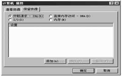 三、是否存在“系统保留”类型的硬件冲突? 如果“资源”选项卡显示“手工设置配置”按钮,则说明设备存在冲突或其他问题,已被禁用;或者设备所使用的资源设置能正常工作,但不符合任何已知配置。如果在“资源”选项卡上,看到的是资源设置框,请确定是否存在“系统保留”类型的硬件冲突:在“系统属性”的“设备管理器”选项卡上,双击冲突的设备,然后在“资源”选项卡上,查看“冲突的设备列表”。如果“冲突的设备列表”下并没有列出任何冲突,说明正在查看的设备不存在硬件冲突。此时,可以重新启动计算机,以便Windows可以重新配置该硬件。有时,即使是特定设备所使用的资源与计算机的保留资源冲突,这种冲突很可能不会出现问题。如果不出现任何其他问题,则可以忽略这种资源冲突。如果冲突使设备出现使用上的问题,请继续以下解决方法。 四、配置一种或多种设备,使之使用不同资源 如果两种设备被配置为使用相同的资源,将其中一种或两种设备配置为使用不同资源,就可以解决硬件冲突问题。 1.在“系统属性”的“设备管理器”选项卡上,双击冲突设备,然后在“资源”选项卡上,查看“冲突的设备列表”,确定哪些资源设置与其他设备冲突。 2.在“资源类型”和“设置”的资源设置列表下,双击与其他资源发生冲突的设置旁的图标。如果收到一条消息,说明只有清除“使用自动的设置”复选框之后才能更改资源设置,则请单击“确定”,清除“使用自动的设置”复选框,然后再次双击“设置”旁的图标。 3.滚动可用资源设置并阅读各种设置的“冲突信息”。如果发现某一设置与其他某个设备并不冲突,请保留“值”框中的所选设置,然后单击“确定”,再次单击“确定”,关闭“系统属性”对话框,并重新启动计算机。 也许需要调整硬件卡上的跳线,才能符合新设置;也许需要运行硬件厂商提供的配置实用程序,这取决于硬件的类型。如果卡上的跳线设置不对,解决冲突问题之后,硬件也还是无法正常工作。 五、释放保留的资源设置 如果“冲突信息”显示所有设置都与其他设备冲突,请连续单击“取消”,关闭“系统属性”对话框,然后释放保留的资源设置: 1.在“系统属性”的“设备管理器”选项卡上,双击“计算机”。 2.单击“保留资源”选项卡,单击发生冲突的资源类型(如图3)wyjc3.tif,如果某个资源设置已被保留,那么,系统中的任何设备都不能使用它。“设置”框中列出了已保留的资源设置。如果此框为空,则说明该类型的设置目前尚未保留。