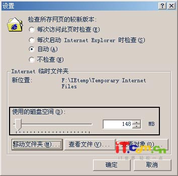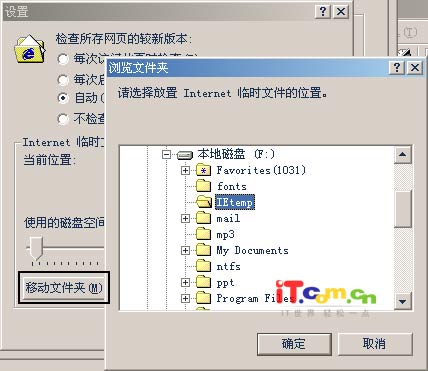 接着在弹出的“设置”对话框中点击“移动文件夹”按钮,选择刚刚建立的文件夹“F:IEtemp”,点击“确定”后会弹出一个对话框,点击“是”,系统就会进行移动临时文件夹,移动好后会重新启动电脑。(图3)