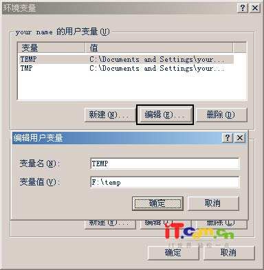 选中用户变量下的“temp”后点击“编辑”按钮,在变量值中输入文件夹路径“F: emp”,设置好后点击“确定”按钮。然后依次对下面的其他几个系统临时文件夹进行同样修改就可以了。(图7)