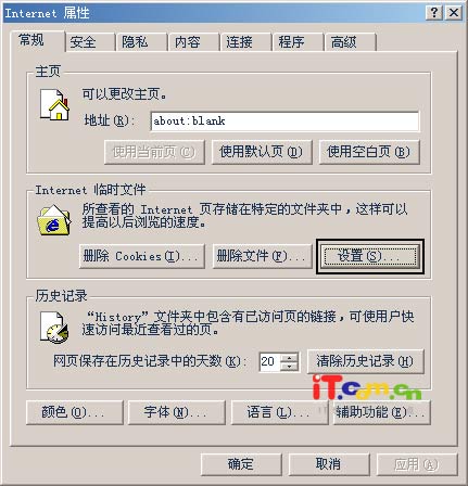 共享IE的临时文件夹 IE的临时文件夹可以让我们来进行离线浏览,共享他们,不仅是节约硬盘空间,更主要的是不必在每个操作系统的IE中都收藏同一个网站的资料,而且在切换了操作系统后脱机浏览网页也可以正常使用。 先新建一个文件夹,比如“F:IEtemp”,然后进入控制面板点击“Internet 选项”,在弹出窗口的“常规”标签下点击“设置”按钮。(图2)
