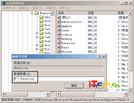 共享收藏夹 收藏夹文件很小,在每个操作系统中复制一下就可以了,但是当在一个操作系统中添加或者删除了收藏夹里的内容时,其他系统中的收藏夹是不会发生变化,所以收藏夹最好也要共享一下,我们可以通过修改注册表的方法来设置共享,操作的方法很简单。 先把要使用的收藏夹保存在硬盘上的某个分区中,比如保存在“F: Favorites”,接着运行注册表编辑器,依次打开“KEY_CURRENT_USER\ Software\Microsoft\Windows\CurrentVersion\Explorer\Shell Folders”主键,在右边的窗口中找到“Favorites”,双击打开这个字符串,把里面的“数值数据”改为新建的收藏夹路径“F: Favorites”,然后点击“确定”就修改好了。另一个操作系统也是这样进行设置。(图5)