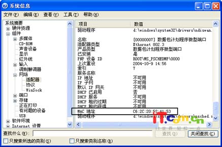 以前在使用Windows 98的时候,系统有一个“Winipcfg.exe”的小工具,它可以方便的简单检查IP网络详细信息,还有网卡的MAC地址,但是这个小工具在Windows XP中就找不到了,最近安装一个Cable Modem,需要输入网卡的 MAC地址,于是就请教了几个老鸟才搞定,下面就把查找的方法和大家分享一下。 点击菜单“开始—所有程序—附件—系统工具—系统信息”,接着在弹出的窗口中点击“组件-网络-适配器”,稍等片刻,我们就可以在右面看见网络适配器的详细信息了,其中就包括MAC地址。(图1)