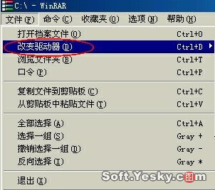 安装完成后运行WinRAR,在WinRAR的“文件”菜单中选择“改变驱动器”(如图),选择一个盘符如C:就可以进入硬盘了。接着我们进入到C:\Windows\System目录下,找到“显示桌面.scf”这个文件并双击运行,这时整个桌面会回到原来Windows的桌面。