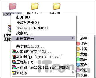 在一个文件夹上点击鼠标右键,在弹出的右键菜单中会多出一个“彩色文件夹”项,选中里面相应的颜色就可以了,这时文件夹图标的颜色就改变了,漂亮吧!如果想把文件夹图标的颜色恢复到以前的样子,那只要在右键菜单中选择“彩色文件夹-还原”就行了。(图2)