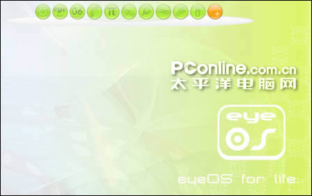 如果您打开了各种功能,上方就会像Windows一样,显示任务栏列表(如图一)。而EyeOS的风格就像苹果操作系统,上面都是一些漂亮的圆圈,点击就可以运行相应的功能了(如图二)。