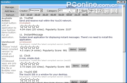点击YouOS的那个菜单下拉按钮,选择“Add/Remove Apps”,再点击“Add New...”就可以找到YouOS为我们提供的大量(约90个)扩展应用功能(如图六),而其中大部分都是一些爱好者原创开发的。