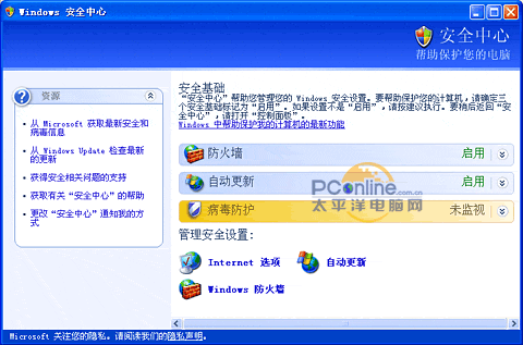安装SP2后,我们可以在“控制面板”中看到“安全中心”选项,其内容如下图所示。