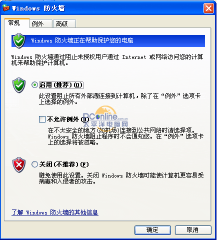 首先让我们见识一下防火墙。从前版本的XP就拥有防火墙功能,但无法与现在这个版本相媲美。除了“安全中心”下方的“Windows防火墙”选项外,控制面板中也有单独的防火墙图标,双击可以进行配置。并且,防火墙在默认状态下是开启的。