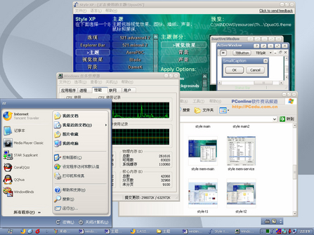 如果说winblind 的软件界面和更换主题以“精致”吸引大多数“爱美”之人的眼球,那么Style XP 则能以超强的DIY性和实用性得到专业玩家的青睐。Style XP 同样带有各种炫目的主题,而且数目更多,再搭配视觉效果、桌面背景、登陆画面、系统图标、启动画面、透明、光标等设置,用户绝对可以组合出一个只有自己才拥有的超酷主题。