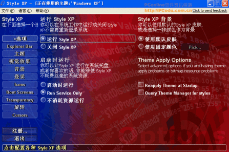 Style XP则可以选择中文界面,可惜汉化版的中文界面只能说是尚未完工的汉化作品,尚有多处仍是英文。其界面同样是左侧菜单目录,包括选项、工具栏、主题、视觉效果、背景、登陆画面、系统图标、启动画面、透明、即主题轮换、光标等11项,显得分类细致,功能全面;右侧菜单详细选项,因此操作起来同样非常方便。
