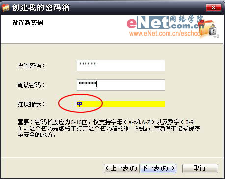 当我们安装完毕,第一次启动“保险箱”时,它便会提示我们输入一个密码。值得称赞的是,这个软件会随着我们密码的输入实时进行检测,如果密码不符合相应的安全要求,它会以红字做出提示,同时禁止我们继续下一步的操作。这样,我们就能轻易地设置好一个安全的“保险箱”密码了,如图2所示。