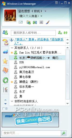 在国内即时交流软件中MSN一直是做为了高端用户的首选,其简洁的界面、实用的功能受到了办公人事的一致好评(如图1)。现在微软将其升级为Live messenger,使其正式成为了Live家族中的一员。Live Messenger除了具有MSN的所有功能外,还提供了离线消息支持,联系人上限提升为600人,隐身交流、图像、文本、声音、视频聊天等实用功能,甚至还可以看接拖曳文件至共享文件夹中,与其它好友一起共享。