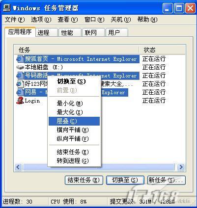 我们在系统内运行某个应用程序时,当前桌面所显示出来的窗口,就是现在运行程序的页面,但是如果一旦运行多个程序,任务栏和桌面就会被各种窗口,以及名称所堆积,从而选择你想要进入的程序,就会显得很费劲。这里要想为指定窗口排序,来方便窗体间的切换,请先打开"任务管理器"窗体,默认选择的是"应用程序"标签,所以大家就不用在进行改变。不过在"任务"栏内,要根据自己的需要按住Ctrl键,选择经常应用到的个别程序,然后在其上方位置处,单击"右键"按钮,选择"层叠"、"横向平铺",以及"纵向平铺"其中一个选项即可(如图1),便可实现对指定窗口的排序。