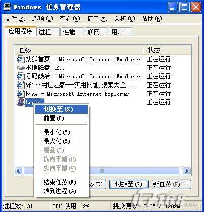 其实殊不知最好解决的办法,就是利用任务管理器来实现无"副作用"的切换,但是事先不要急于返回游戏窗口,要先打开"任务管理器"窗体,在上方栏目标签处,选择"应用程序"标签,此时面板编辑区内,就会显示出当前系统正在运行的程序文件。这里选择自己想要切入的游戏程序,单击下方"切换至"按钮(如图2),就可返回刚才你所切出的游戏程序,并且在其游戏功能方面,没有受到任何外来影响,绝对是"完美无暇"的切换方法。