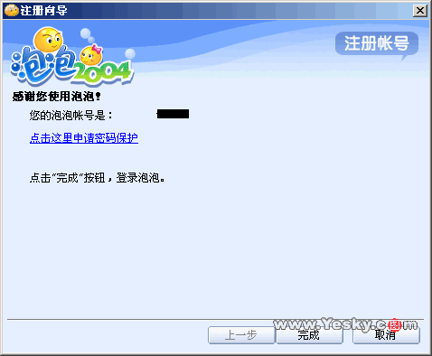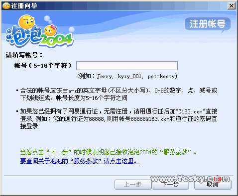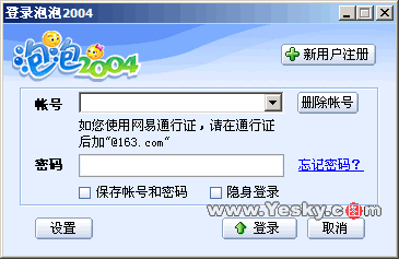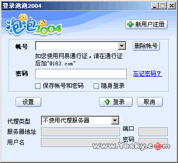 下载安装完泡泡,我们首先注册一个帐号。帐号是免费的,也没有限制,不像QQ那样长时间不用会被腾讯收回。帐号可以是数字、字母、点、减号、下划线,长度在5-16个字符之前。如果你拥有网易通行证,可以直接用你的网易邮箱帐号登录。遗憾的是,如果你安装有泡泡2003的话,不能升级安装新泡泡,2004的泡泡会在一个新目录下安装。这对老用户带来了一些不便。运行泡泡2004打开登录界面(如图1)。