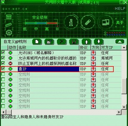 使用带补丁的QQ可以查到好友的IP地址,但却无法查陌生人和隐身人的IP,该怎么办呢?使用天网防火墙就可以了!只要他们发消息给你就可以查得他们的IP地址。