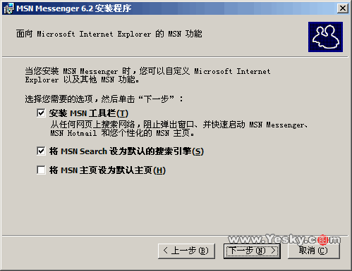 安装msn时会提示,是否安装msn工具栏、是否把msn search设为默认搜索引擎、是否把MSN设为首页(如图1)。捆绑一直是微软的“看家绝技”,每当微软某一软件无法单独打败对手时,都会祭出这一绝招。不知下次是不是会在windows的sp×中集成msn工具栏。现在的IE工具栏插件实在是太多了,如果都装上的话,估记满屏都是工具栏了。-_-!!好在笔者根本就不用IE。^O^