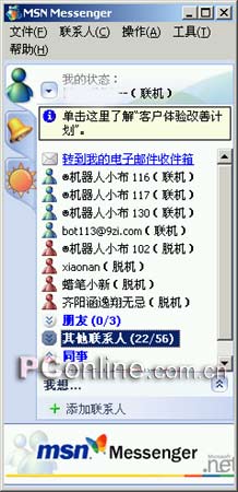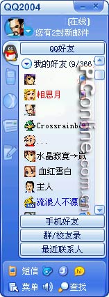 界面就是一款软件最先面对用户的地方,如果做得不好会直接影响用户的观感,严重的甚至会令用户厌恶。在这方面四款软件都显得比较出众,不过遗憾的是MSN在新版的界面中还是老样子,方方正正的,在众多更出色的同行中显得比较“朴素”。反观Yahoo messenger就大大改良了他的用户界面,显得比较轻松细腻,让人眼前一亮。 QQ 2004预览版界面